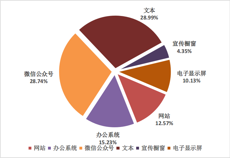在主动公开的信息中,通过校园网及院外有关机构及部门网站(中直采购网、国家研招网等)方式进行公开的信息350条,占主动公开信息的比例为12.57%;通过院内办公系统方式公开的信息424条,占主动公开信息的比例为15.23%;通过文本方式公开的信息807条,占主动公开信息的比例为28.99%;通过宣传橱窗公开的信息121条,占主动公开信息的比例为4.35%;通过电子显示屏公开的信息282条,占主动公开信息的比例为10.13%;通过微信公众号公开的信息800条,占主动公开信息的比例为28.74%。