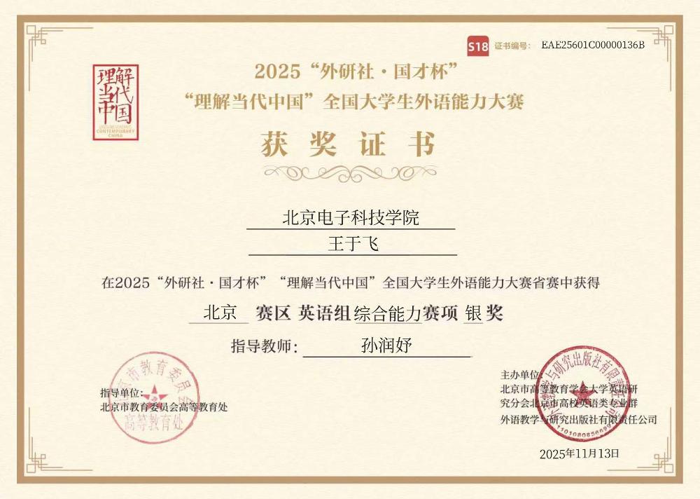 2025“外研社·国才杯”“理解当代中国”全国大学生外语能力大赛省赛于2025年11月1日举行。该项赛事连续多年入选“全国普通高校学科竞赛排行榜”,系2025年教育部认可的84项全国大学生赛事之一。本次大赛以习近平新时代中国特色社会主义思想为指导,旨在深化“三进”工作、创新课程思政,推进教育改革、检验教学成果,讲好中国故事、服务国际传播。大赛由北京外国语大学主办,外语教学与研究出版社承办,赛程紧凑,赛项丰富。永利官网共组织参加综合能力、英汉笔译、英汉口译、英语演讲等四个赛项。经校内初选,从477名报名学生中遴选出的14人在省赛中表现优异,3人荣获银奖,11人荣获铜奖,展现出扎实的语言功底与良好的综合素养。